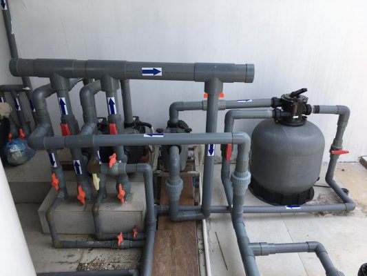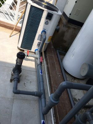 Bể bơi có kích thước 4×10×1.35m. Bể nằm trên tầng mái, với đầy đủ công năng như bể bơi, khu sục jacuzi, tắm massage đầu, đảm bảo cho chủ nhân ngôi nhà thư giãn sau những khoảng thời gian làm việc vất vả, lấy lại sức khỏe cũng như rèn luyện sức khỏe hàng ngày Là công trình bể bơi cá nhân, yêu cầu cần sự ổn định, bền bỉ, toàn bộ thiết bị sử dụng của các hãng nỗi tiếng như Kripsol-Spain, Altis-HongKong, Aquacal-Mỹ – BÌnh lọc coposite D750 lưu lượng 21m3/h, thương hiệu Astralpool-Spain, số lượng 01 – Bơm lọc KSE150M, thương hiệu Astralpool-Spain, số lượng 01 – Đèn bể bơi, công suất 24w/12VAC, inox 304, thương hiệu Altis-HongKong, số lượng 10 – Thiết bị ngoài thành bể bơi đầu trả nước, tấm thu đáy, đầu hút vệ sinh, rãnh thu tràn, thương hiệu Altis-HongKong – Để thuận tiên việc lên xuống bể bơi và an toàn cho người bơi, bể sử dụng 01 thang 3 bậc và 01 thang 4 bậc, thương hiệu Altis-HongKong – Hệ thống van đóng/mở, van 1 chiều sử dụng cho hệ thống phòng máy sử dụng thương hiệu Altis-HongKong – Hệ thống heatpump làm nóng nước bể bơi Aquacal-USA
